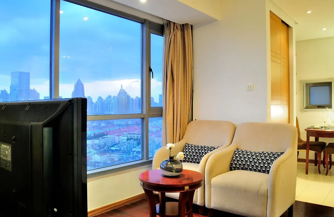 Kingland Service i Shanghai erbjuder rum med matplats och balkong tillsammans med strykutrustning, strykjärn med strykbräda och luftkonditionering samt Wi-Fi och plattskärms-TV med satellitkanaler. Rummen är inredda med sten eldstad och ljudisolerade fönster, och har minibar. I badrummen finns hårtorkar och handdukar, samt ett spabadkar, en duschkabin och en separat toalett.